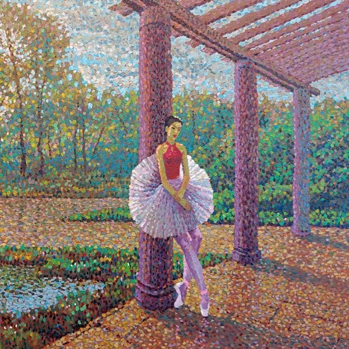 The painting is done in the style of pointillism, using oil paints on canvas. For the image of the painting, I used the model, ballerina Yasmina Arsova, who lives and works in Berlin, Germany. I painted this artwork in London, United Kingdom, where I work and reside.